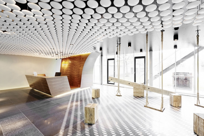 本案为办公室装修项目,整个空间由入口进入向周围发散,形成线条感极强的开放展示空间。空间主要分成两个部分,一部分是开放的办公空间;另一部分为独立办公空间,这样分隔有利于空间的布局和交通的引导,在设计手法上采用对称的切割手法将原有空间分割并统一。 前台的区域与公司的公共办公区域是连在一起的,使用立柱生态木栅栏隔开来,...