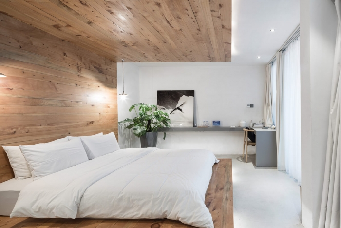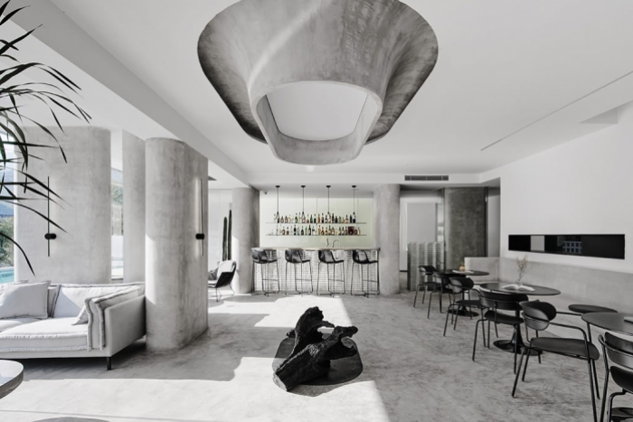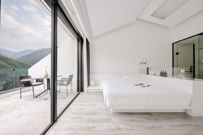 本民宿案例运用自然的现代及朴素的空间风格,纯白和灰色去构建抽象的多种生活背景。白色提供无限延伸的想象可能性,灰色提供对自然的谦卑使用和贴近感。空间需要发声。诗词和摄影,对应到空间体验和对景。山林脚下的交际空间,人们乐意在自然下栖居,聚会,沉静和独处。有意的增加墙体的延伸和悬浮,使得人与包裹的建筑发生直接及亲密的关系。