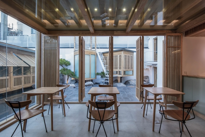 ※项目原功能是旅馆,随着时代变迁和城市再造更新,在加固原有结构的基础上解构新的民宿含义。楼内空间狭小,光线不足,改造的重点便是空间重构,为原本狭小昏暗的内部空间引入阳光和自然。在设计过程中解决了建筑间的孤立状态,使客房、前厅大堂和咖啡厅视觉上遥相呼应,院落的引入集中体现了传统建筑的造园思想。※民宿客房在朝南的主楼,楼内...